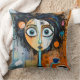 En viskig flicka med överdrivet stort ögon och ett krångligt uttryck presenteras mot en färglös bakgrund fylld med abstrakter och symboler. Blå kopp av kaffe.