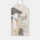 Express your gratitude with a touch of whimsical elegance. This thank you gift tag features a beautiful, hand-painted watercolor sketch of a graduate from a back-view perspective. The design highlights a stylish black mortarboard adorned with a delicate border of white pearls and a stunning, oversized fabric bow with long, flowing tails. To complete the look, the graduate holds a lush bouquet of creamy white roses.