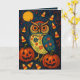 Send a little Halloween magic with this folk art owl, painted under a swirling moonlit sky and surrounded by jack-o’-lanterns, candy corn, and decorated with Day of the Dead blooms. Mysterious and sweet, like a storybook about an October night. Its charming, slightly spooky vibes will send whimsical autumn greetings and personalized Halloween wishes, bringing a cozy, festive greeting to their mailbox.