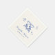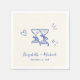 Whimsical light cream napkins for your engagement party, rehearsal dinner, wedding reception, etc., featuring french blue hand-drawn illustrations of a heart, stars and toasting wine glasses, and the names of the bride and groom in a playful blue script.
