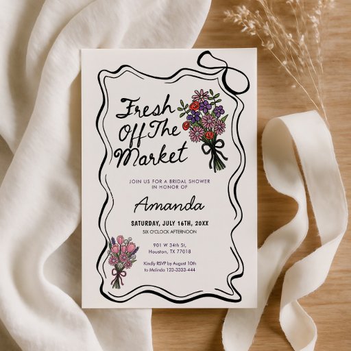 This editable farmers market bridal shower invitation it the perfect choice for a "She’s Off the Market" themed brunch or summer bridal celebration.