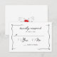 Whimsical handskriven bröllops-svarskort med en handritad snörig ramdesign och två fåglar med körsbär på baksidan. Dessa svarskort finns i färgschemat svart, vitt och rött.