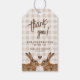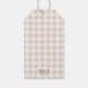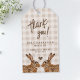 Personalizable wedding thank you gift tag featuring Destei's beige gingham background with two brown hare heads facing each other with a brown heart silhouette between them. Personalize the sample text areas and notice how the back has space for custom initials and date as well. Perfect for rustic, countryside, woodland or spring weddings or celebrations.