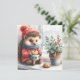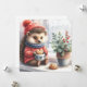 En vattenfärgsillustration av en hedgehog sitta på en fönsterskiva. Hedgehog bär en röd tröja med en mönstrad design som liknar en vinter mönster eller snöflake mönster och en marin blå scarf med liten vit polka dots. Den har också en röd trikå med pompom. Hedgehog håller mugg eller kopp i tassar. Inuti kopp finns en hjärtformad kaka med choklad chip. Det finns en krukplanta med grönt löv och röda bär på fönsterluckan, framför hedgehog. Hela stil är söt och viskigt.