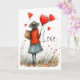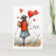 Gå med oss på en viskartad resa i kärlek med detta fantastiska hälsningskort som är en härlig illustration inspirerad av kärlek i ord. Möt den vackra flickan i hennes röda och svarta hatt, omgiven av en bukett med pulserande röda hjärtformade ballonger, när hon sprider kärlek och glädje med varje steg. Låt denna hjärtslitande scen påminna er om att fira de enkla och magiska stunderna i kärlek i livet. värmen med någon speciell och gör deras dag lite mer nyfiken! Skicka det här kortet som ett Valentindagskort eller till någon speciell som du vill uttrycka kärlek till.
