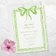This whimsical bridal shower invitation features a bright lime green watercolor bow and a playful scalloped rectangle frame against a classic lime green and white striped background. Perfect for a shower with a preppy or coastal aesthetic, this charming design provides a sweet, hand-painted look for your special celebration. Created by Simply Farmhouse Press.