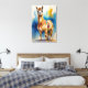 Den här snygga vattenfärgsmålningen har en leende lampa som är försedd med en levande, mönstrad filt. Bakgrunden är en abstrakt stänk av blått och gult, som på ett vackert sätt står i kontrast till de varma tonerna i lamas päls. Blandningen av realistisk djurbild och konsthistoriskt stil skapar ett biet som fångar öga och som förenar naturligt inslag med konstnärligt uttryck, perfekt för att tillföra en gnutta glädje och färg till alla platser.