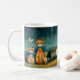Embrace the magic of a starlit night with this enchanting folk-art-inspired ceramic mug. Featuring stylized, patterned cats gathering under a glowing full moon, this wrap-around design transports you to a peaceful countryside meadow. With a cozy lit cottage in the background and vibrant wildflowers at their feet, it’s the perfect companion for your morning coffee or evening tea.