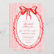 This whimsical bridal shower invitation features a bright red watercolor bow and a scalloped oval frame against a classic striped background. Perfect for a shower with a preppy or coastal aesthetic, this charming design provides a sweet, hand-painted look for your special celebration. Created by Simply Farmhouse Press.