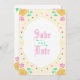 Färgglatt och ljust save the date-kort i en blommig fantasifull tema.