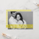 Whimsikal Save the Date-kort med foto och skript, anpassningsbart kort med genomskinlig gul banner och fantasifullt kalligrafiskrift.