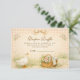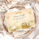 A charming storybook-style baby shower design featuring a sweet watercolor goose standing beside a nest filled with pastel eggs. Delicate spring flowers and soft greenery create a gentle countryside scene, while a blush bow and sage gingham background add a cozy cottagecore touch. The vintage illustration style and soft pastel palette give this design a whimsical nursery feel, perfect for a playful and heartwarming baby celebration.