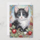 Whimsikalisk julkort med en söt svartvit kattunge omgiven av julibär. "God Jul" på baksidan kan anpassas eller lämnas tom för ett handskrivet meddelande. Perfekt för kattälskare. Besök min butik för mer konst med svartvit katt!