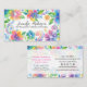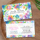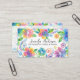 This business card features a watercolor style border of abstract flowers, spirals, circles, and flowing lines. The color palette combines soft pink, blue, yellow, mint green, and purple to create a warm, organic aesthetic. The design feels approachable and imaginative, making it an excellent choice for professionals who work with children or use creative modalities.