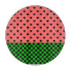 Köksskivan har rosa och svart vattenmeloner mönster med mörk grönt schackbrädet grund gräns.