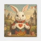 Fall in love with this charming and unique take on the White Rabbit from Alice in Wonderland! This delightful illustration portrays a cute, anthropomorphic white rabbit seated at a rustic table, holding a heart-adorned invitation or card. Dressed in a whimsical red and green outfit, he's ready for a tea party in an enchanting landscape dotted with fairytale castles, colorful banners, and blooming flowers. Teacups and a cake complete this sweet and imaginative scene, perfect for fans of Alice in Wonderland and anyone who adores whimsical, heart-filled art.