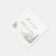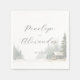 This wedding napkin features a serene, wintery landscape with a cozy cabin nestled among evergreen trees. The design uses soft whites and grays to evoke a snowy atmosphere, complemented by muted greens for the trees and subtle brown for the cabin. Elegant cursive typography adds a romantic touch, while the watercolor art technique gives the scene a gentle, dreamy quality. Perfect for an intimate celebration, this design captures the tranquil beauty of a winter retreat.