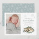En charmig vinter födelse meddelande kort med en akvarell baby hjort liggande i en säng av grönska tillsammans med en "Vi presenterar" kalligrafi header och söta födelse statistik. Glittrande snöflingor accentuerar designen i mjuk salvia, skiffer och naturliga tan toner. Baksidan är klädd i ett koordinerande snöflinga mönster. Ett "Välkommen med kärlek" familjemeddelande och all text är helt anpassningsbar.