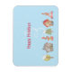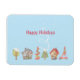 Vintergatan med vita vinter har burkar, träd med täckt snö och en bil med presenter staplade överst. Allt på en ljusblå bakgrund med magisk snö spiral. Anpassadet "Glad helg" i modernt teckensnitt
