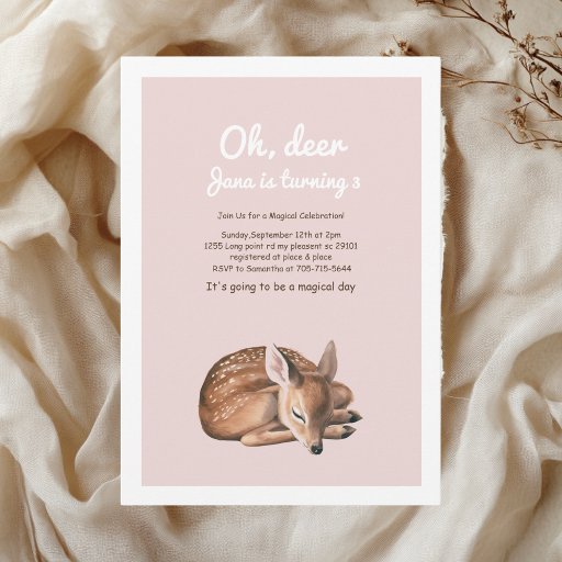 Gratulera till din lilla speciella dag med den här vackra barnens födelsedag med en söt hjort mot en mjuk rosa bakgrund. Perfekt för ett skogsområde eller ett djurtemat party. Den här charmerande designen fångar en lekfull, vibb som både barn och föräldrar kommer att göra i kärlek. Med varsam pastel färg och en söt skogsvän är det idealiskt för små barns födelsedagar och passar perfekt med en mysigt, magisk party-atmosfär. Anpassa det med dina uppgifter om party för att göra ditt barns födelsedag extra minnesvärt!