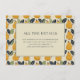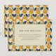This wedding enclosure card features a charming design with a repeating pattern of stylized pears and leaves in warm yellow-orange hues against a light beige background. The central cream-colored box, framed by a double border, contains elegant serif typography that guides guests to find more details online. The playful yet sophisticated layout combines organic shapes and clean lines, creating a welcoming and cheerful atmosphere perfect for celebrating your special day.
