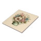 Keramisk platta med en söt bild. Blå, rosa och krämfärgade blommor med gröna blad. Inramad i en grön blomkruka med en grön rutig duk som hänger över kanten.