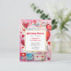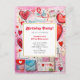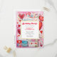 Födelsedagsfest inbjudan vykort med ett vismiskt mönster. Skrapboksdockor och skräp i stil. Röda och rosa hjärtan och olika brev och kuvert är spridda över hela världen.