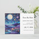 Spara datumkortet med en vacker illustration. Vit och fantasifull vibe. En stor glödande måne med stjärnor överallt. Hängande över ett vackert landskap i träd, berg och en likviderande flod.