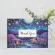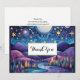Tack kort med en vacker illustration. Vit och fantasifull vibe. En stor glödande måne med stjärnor överallt. Hängande över ett vackert landskap i träd, berg och en likviderande flod.