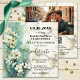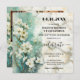 En konstnärlig, vismisk bröllopsinbjudan med en målning av vita blommor på marmor. På baksidan finns ditt favoritfoto och en valfri QR-kodmall med information om svar.