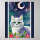 Konstnärliga poster funktioner och en AI-genererad digital vattenfärgsmålning av en söt vit- och grått-katt med kosmisk himlar-bakgrund