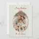 Skicka varm helgdag med det här eleganten raderade jokertecknet. Med en mjuk grönt och vit strimlad bakgrund, ger den här designen ett snyggt ramar av ditt familjefoto med ett festive Red scalloped gräns och bog accent. Det glada "God jul" hälsning visas högst upp i ett lekfullt skript, medan namn i din familj markeras vid grund för en personlig.