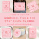 Trendig-inspirerade rosa bröllop-blöjor för din förlovningsfest, repetitionsmiddag, mottagning osv., med en röd vågigt ram, med coquettkrukor, vismliknande hand plockade illustrationer av ett hjärta, stjärnor och vin-glas och namnen av bruden och brudgummen i ett lekfullt skript.