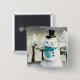 En knapp med ett sött teckning med snögubbe med coola top hat och halsduk. Bakgrunden har en linje av visktäckt snö-täckt gräs träd.