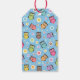 En lekfull och färglös sömlös mönster med tecknad uggla på olika ljusa färger som rosa, orange, grönt, brun och blå. Uggla är omgivet av en blandning av små, flerfärgade blommor på en mjuk blå bakgrund, som skapar en glad och nyfiken design. Perfekt för barnprodukter.