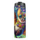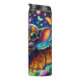Ett sött, hårig fladdermus med stort, dekorerat vingar och runda solglasögon med blommor flyger glädjande. Den bär ett halsband av färgstarka blommar och omges av vibrerande fjärilar, svampar och roterande stjärnor mot en snurrande blå bakgrund och grönt bakgrund.
