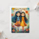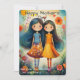 En lycklig mormorsdags gratulationskort med en fantasifull och färgrik illustration av två små flickor som står sida vid sida i en livfull, stiliserad trädgårdsmiljö.