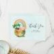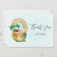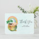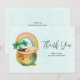Tack för ett kort med en vacker illustration med en leende grönt och guld med en söt regnbåge, ett moln från lycklig och lite grönt klöver.