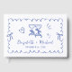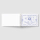 Unik, återinspirerad gäst i bröllop bok med fransk blå vågigt ram med coquette-kran, visuella illustrationer av hand plockade av ett hjärta, stjärnor och vin-glas och namnen av bruden och brudgummen i ett lekfullt blått skript.