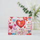 Ett vykort med ett vismiskt mönster. Skrapboksdockor och skräp i stil. Röda och rosa hjärtan och olika brev och kuvert är spridda över hela världen.
