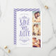 Meddela ditt datum i stil med den här 3-fotot spara datumkortet med fet typografi. Baksidan har en strimlad mönster och ytterligare ett foto och text.