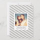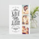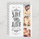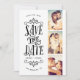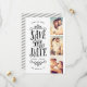 Meddela ditt datum i stil med den här 3-fotot spara datumkortet med fet typografi. Baksidan har en strimlad mönster och ytterligare ett foto och text.