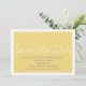 Whimsy Spara datum-anmälan i gult och vitt med en enkel och rolig skript typografi design. Denna trendiga spara datum-inbjudan är lätt att anpassa med dina bröllopsdetaljer. För fler anpassningsalternativ, klicka på knappen Anpassa.