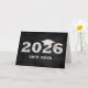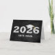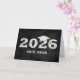 White graduation cap with 2026 text and "CONGRATS and GRAD" word cloud on a black leather background for a graduate.