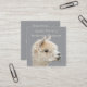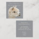 Little business cards with cute alpaca image. Gray, 2.5 inch square cards with custom, off-white text on both sides. The sample wording has the business name above the alpaca image, with all information on the back. Include location, contact, online presence, hours of operation, and / or product information.