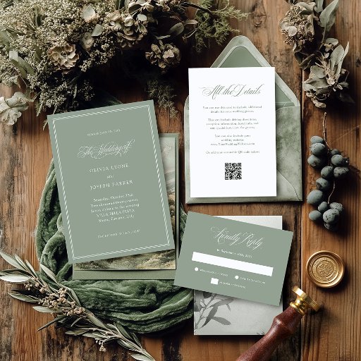 De här detaljerna i elegant, vitt och sage grönt bröllop innehåller kort med klassiskt, gammalt stil med romantisk kalligrafi. Lägg till webbplatsen bröllop eller skriv bara in informationen om hotellrum, köranvisningar och annan viktig information för dina gäster. Ange tonen för din lyxiga, sofistikerade Italien som inspirerade bröllop med den här klassiska, minimalistiska designen.