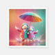 Två vackra ankor med färgstarka regnrockar står tillsammans under ett stort, vibrerande paraply under en regnstorm