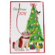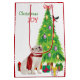 På vardera sidan av denna Helgdag presentsäck bär en vit Bulldog en röd halsduk medan han tittar på en bullfink fågelland på Julgran. Omkring den hund som är lätt inslagen är paket splittrat. I den röda och grönt texten står det "Jul JOY".