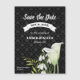 Spara datum meddelande designat baserat på min vattenfärgbild av vita lök med sina mjuka petaler och färska löv av grönt och bra av petaler och löv. Produkten har mörk grått och svart dammmönster på bakgrunden. Anpassa den till min butik för att få en personlig.