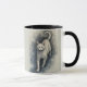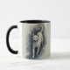 Mug in an illustration of a graceful, long-haired white cat with piercing blue eyes strides confidently forward against a smoky, cloud-like background. Rendered in a detailed ink illustration style, the image evokes a blend of traditional Chinese ink painting and contemporary digital art.